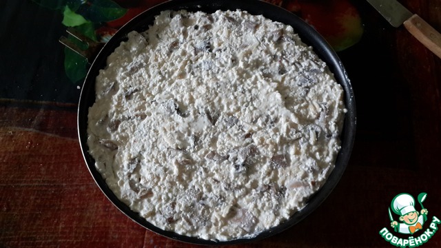 В миске смешиваем творог, йогурт, натёртый сыр и яйцо, добавляем грибы, соль и зелень.