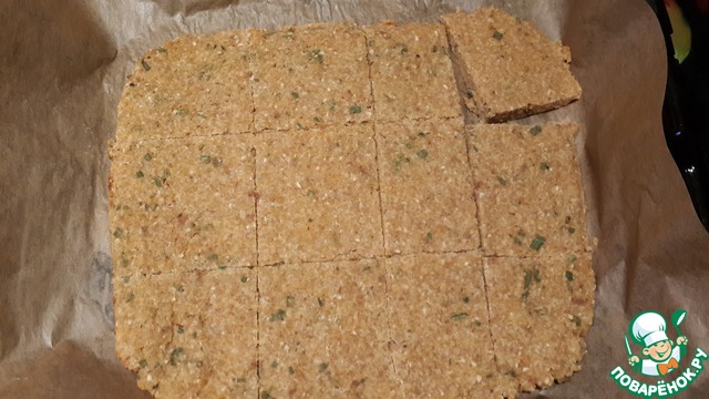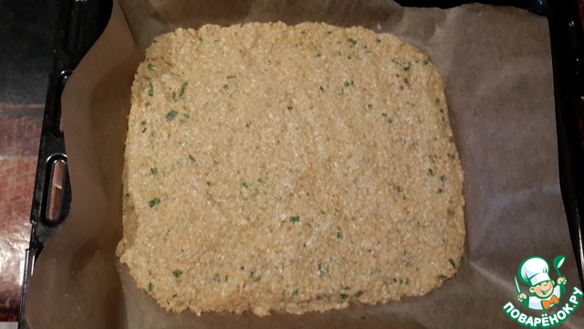Застилаем противень бумагой для выпечки и выкладываем нашу массу, формируя прямоугольник (толщина около 1 см).