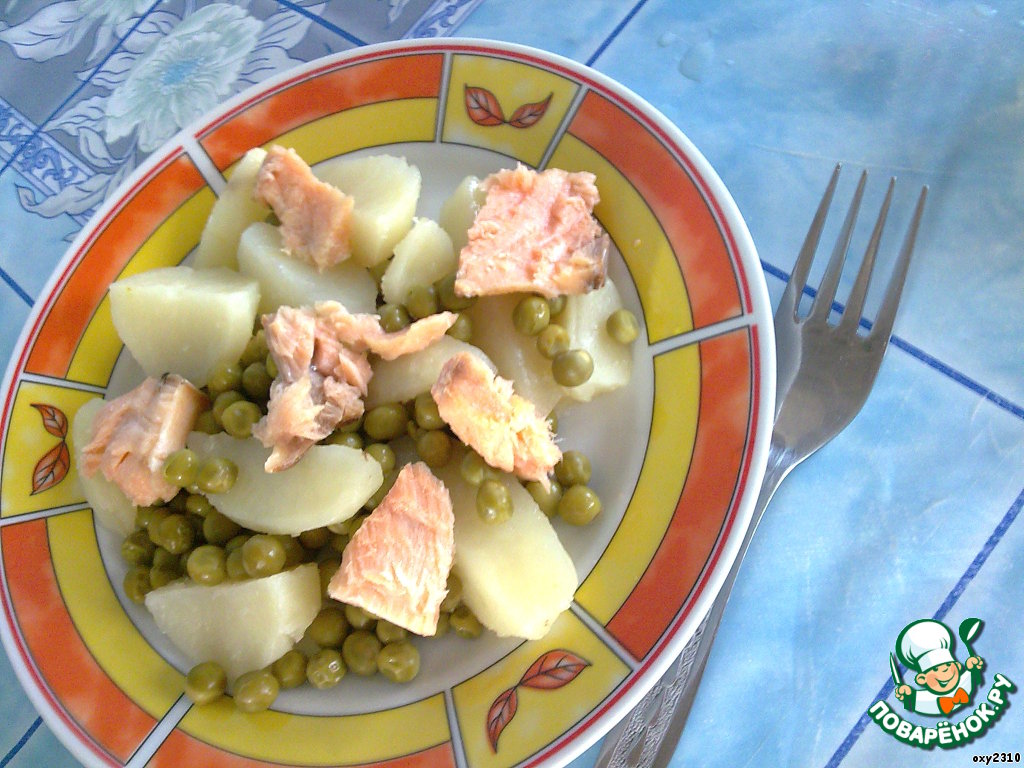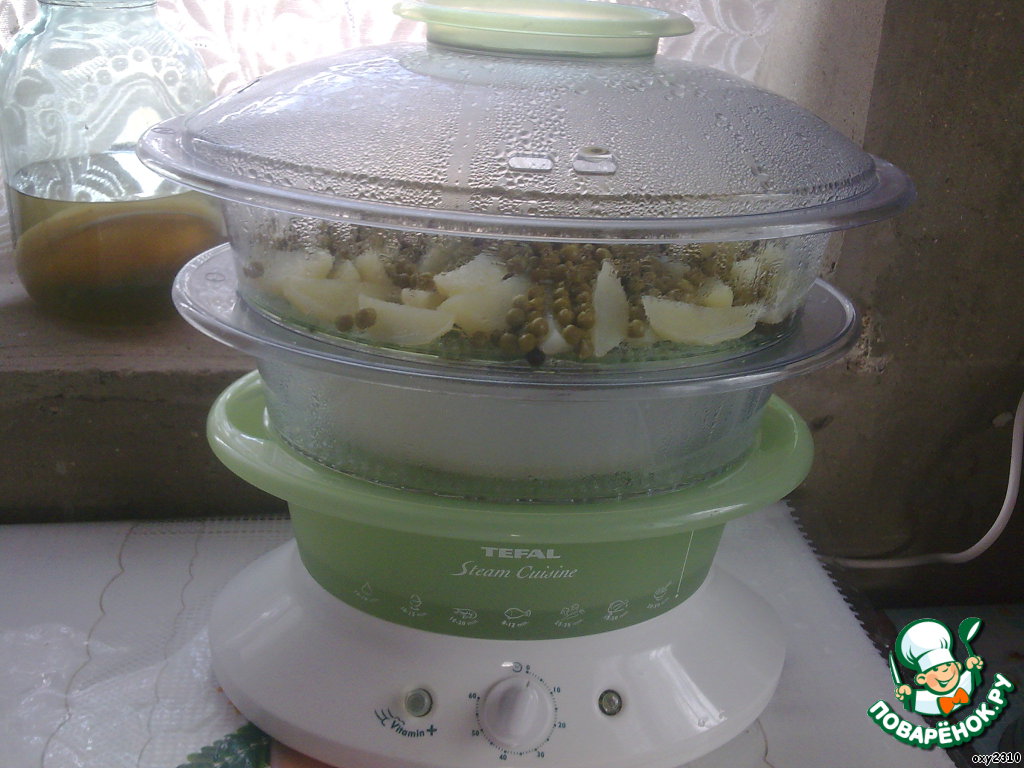 Картошку режем на 4 части, так же и лук. Добавляем 7 зубчиков чеснока. Готовим 20 мин и добавляем 300 г горошка консервированного, и щепотку соли, готовим еще 5 мин.