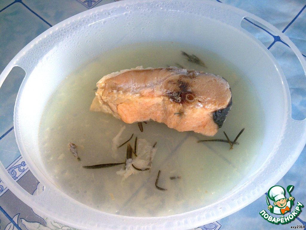Семга (малосольная) - 15 мин и готова. За 5 мин до конца приготовления добавить 1 ст.л. лимонного сока и веточки травы розмарина - 1 ч.л. Из готового блюда (в конце) нужно его удалить. Розмарин дает пряный аромат.