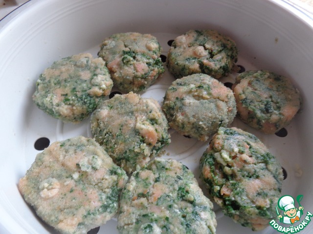 С помощью ножа мелко порубить семгу. Добавить к рыбе размороженный шпинат, рикотту и слегка взбитое яйцо, соль и перец. Сформировать небольшие шарики и обвалять в сухарях. Полученные биточки поместить в чашу мультиварки и выставить программу пар 20 минут.
