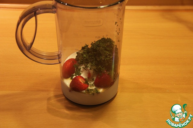 В мерный стакан добавляем йогурт+клубника+изме льчённая мята со льдом.