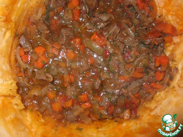 Мясо порезать на куски порезать кусочками обжарить на сковороде с ложкой растительного масла, добавить к нему лук и морковь и если будет мякоть тыквы и все обжарить на сильном огне часто мешая, когда овощи и мясо выделит сок снять с огня и выложить все в тыкву