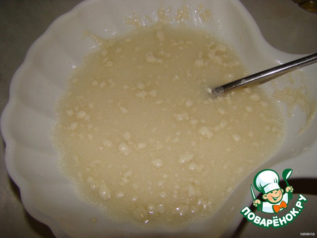 Сначала делаем кляр. Так как он у нас должен в течение 15 минут разойтись. В теплую воду добавляем растительное масло, соль, муку, хорошо перемешиваем, накрываем крышкой