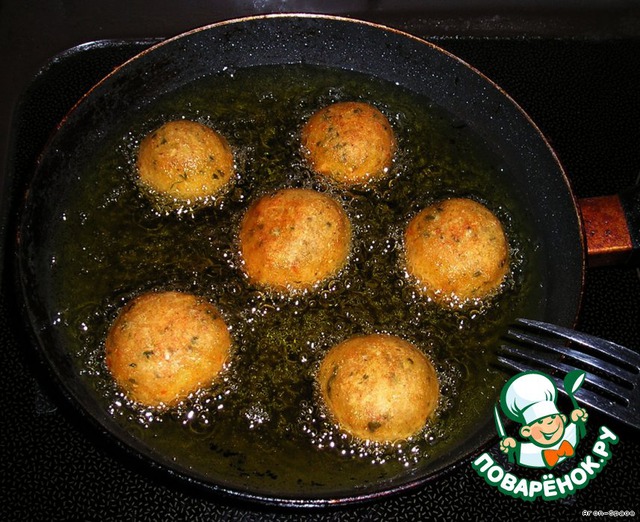 Жарьте шарики в растительном масле на небольшом огне, до золотисто-коричневого цвета. Жарить нужно минут 20, это зависит от размера шариков.