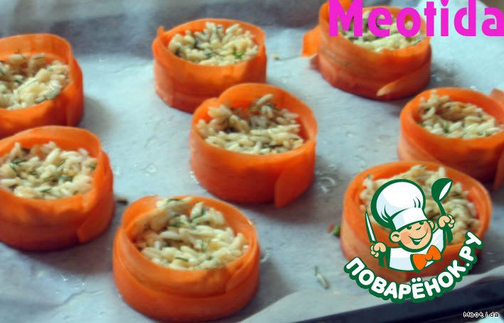 теперь берем полосочки фольги, смазываем их маслом и оборачиваем корзиночки по кольцу, как морковочкой, чтобы они не потеряли форму при запекании