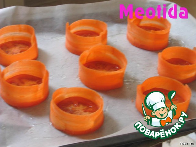 выкладываем помидорчики и оборафиваем из морковочкой, в несколько слоев, внахлест..последние полосочки надо с двух сторон смазать маслом