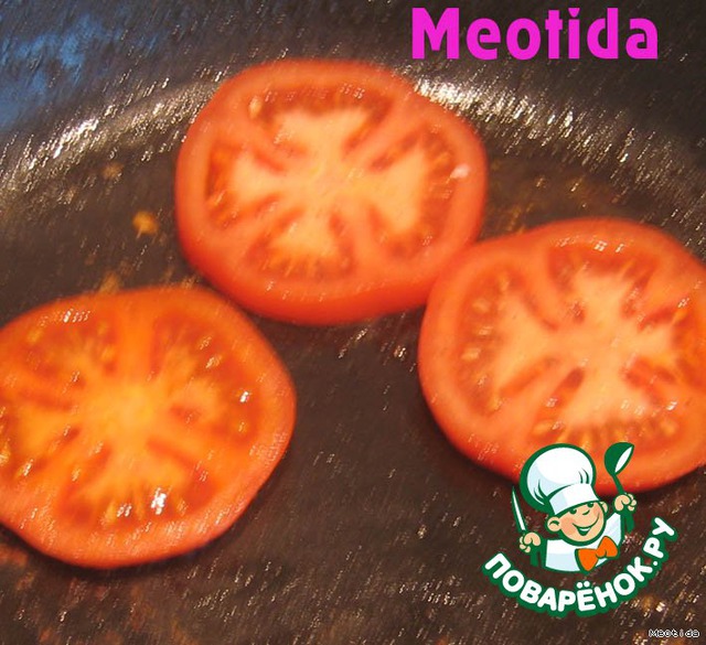 помидоры нарезаем кружочками (из одного помидора получается 4 кружочка), посыпаем слега солью и перчиком с двух сторон и слегка обжариваем на раскаленной сковородке в 2 ст.л. масла (лучше оливкового)..жарим по 10 секунд с каждой стороны и убираем на тарелочку