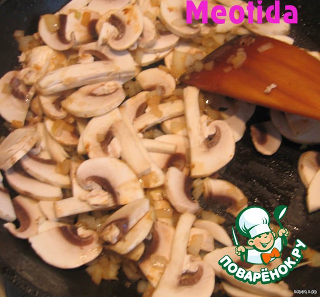 в сковородке обжариваем до золотистого цвета измельченный лук, добавляем тонко порезанные грибочки и, помешивая, жарим до готовности, не забываем посолить и поперчить