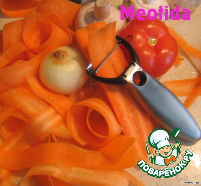морковочку берем длинную и толстенькую и нарезаем длинными тонкими полосками, можно ножом для чистки овощей