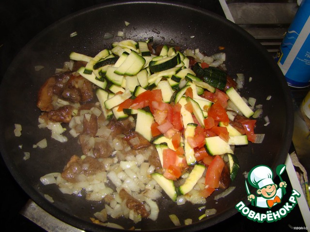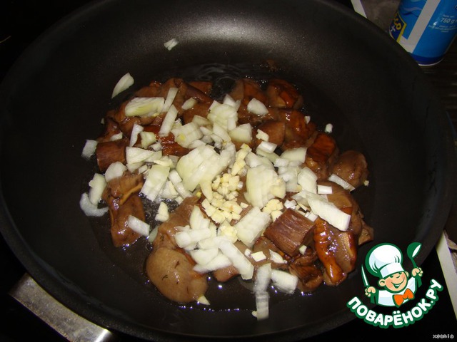 Ставим в духовку на 15 минут..запекаем при температуре 250 до золотистого цвета..А тем временем...Обжариваем с луком чесноком грибы