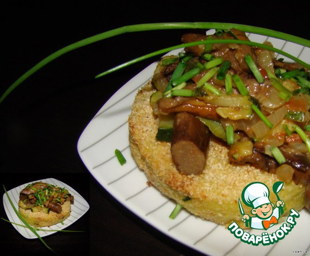 Наши биточки готовы...сверху положили овощную...грибную смесь...(Можно брать любые овощи..Перец сладкий...морковь...капуста....Все что угодно...)))Приятного Аппетита!!!!!