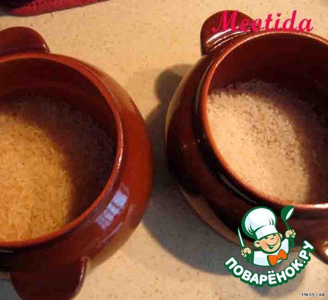 насыпаем в каждый горшочек по 1/2 стакана риса (я брала круглый рис..он получается нежным..таким сивочным и красивым..очень нежным..если Вам нравится рассыпчатый рис, то надо взять пропареный длинный рис..)