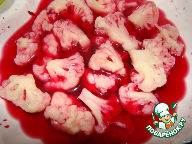 Капуста сварилась.Капусту которую мы варили просто в воде,положим в сок свеклы на пару минут( потрите свеклу Немного разбавьте водой,затем пропустите через сито что бы отделить свеклу от сока)
