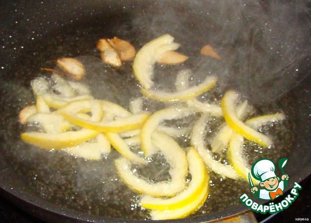 Дольку чеснока режем на несколько пластиков.Нагреваем растительное масло ,Бросаем чеснок в масло..затем и цедру лимона обжариваем на среднем огне помешивая 5 минут
