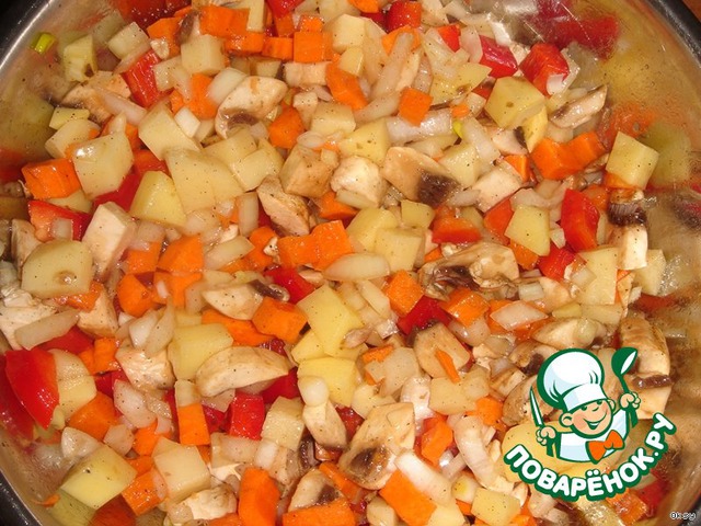 Готовим начинку. Все овощи порезать мелкими кубиками. Посолить и обильно поперчить, добавить растительное масло и перемешать.