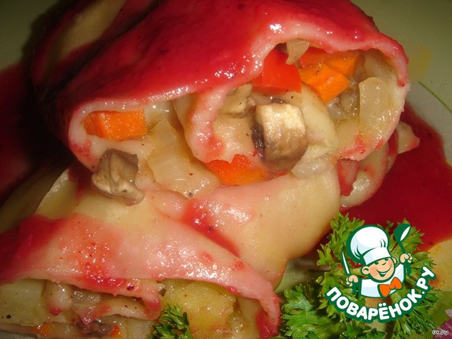 | Такие рулетики не оставят равнодушными даже самых заядлых мясоедов. Очень сочная, вкусная, ароматная начиночка из овощей в обрамлении тонкого теста, под изумительным клюквенным соусом... Рулетики готовятся на пару, что позволяет максимально сохранить так необходимые сейчас витамины. Для дорогих поварят, которые соблюдают пост. Думаю, что это блюдо вполне имеет шанс на участие в конкурсе "Постимся с Moulinex". |