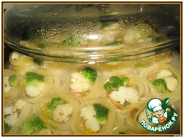 Затем укладываем в каждую по веточки капусты цветной и брокколи. И тушим на медленном огне под закрытой крышкой 5 минут.
