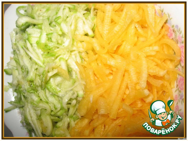 Тыкву и кабачок трем на терке.