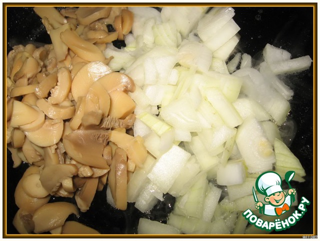 Обжариваем лук и грибы, добавив специи, соль.