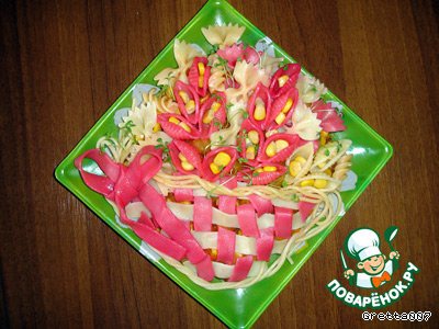 И выложим на рагу любой рисунок из обычных и окрашенных макарон. Зелень тоже не будет лишней :-)