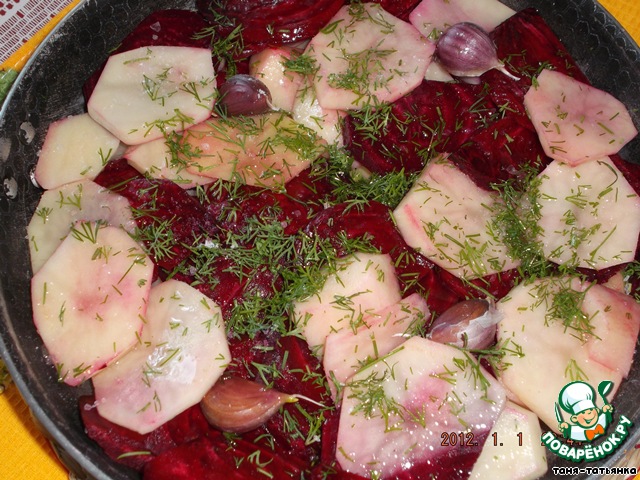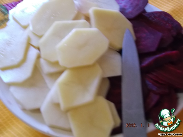 Картофель и свёклу помыть, очистить от кожуры и нарезать тонкими кружками.