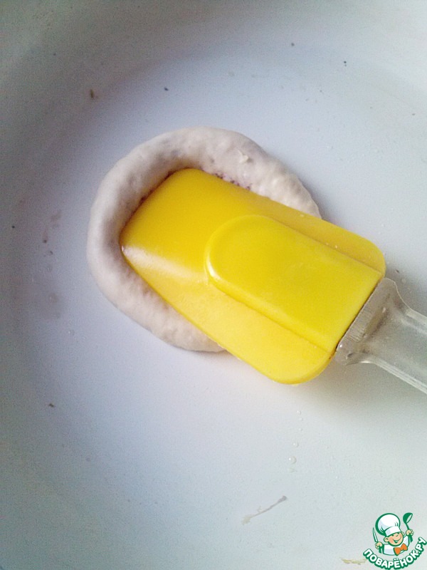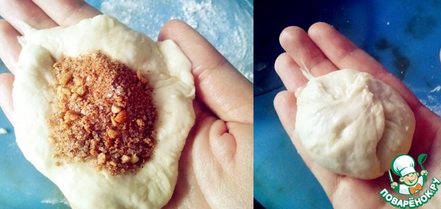 Начинаем формировать сам хотток. Тесто получается липким, поэтому руки лучше смазать маслом. Отщипываем часть теста, делаем из него лепешечку, во внутрь которой помещаем начинку.