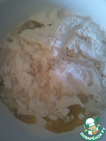 В большую миску всыпаем муку, льем масло, добавляем гашенную соду, медленно доливаем воду, помешивая смесь рукой.
