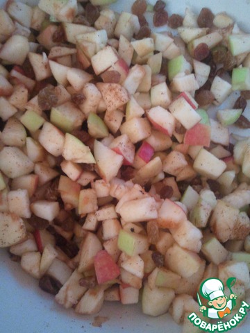 Берем яблоки, очищаем от семечек и режем на кубики. Высыпаем в тарелку или миску и добавляем корицу и изюм. Перемешиваем.