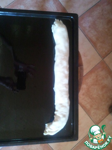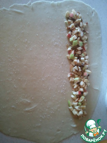 Далее выкладываем сверху яблоки и заворачиваем тесто рулетиком. Можно смазать сверху растительным маслом.