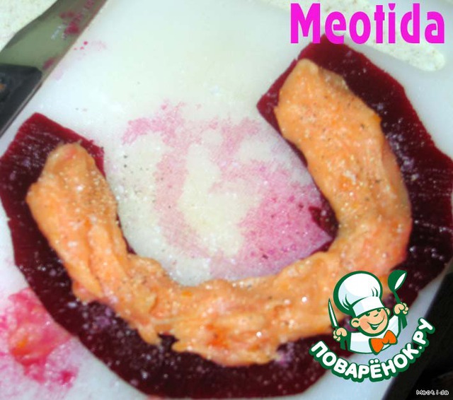 намазываем свеколку картофельно-морковным пюре с одной стороны