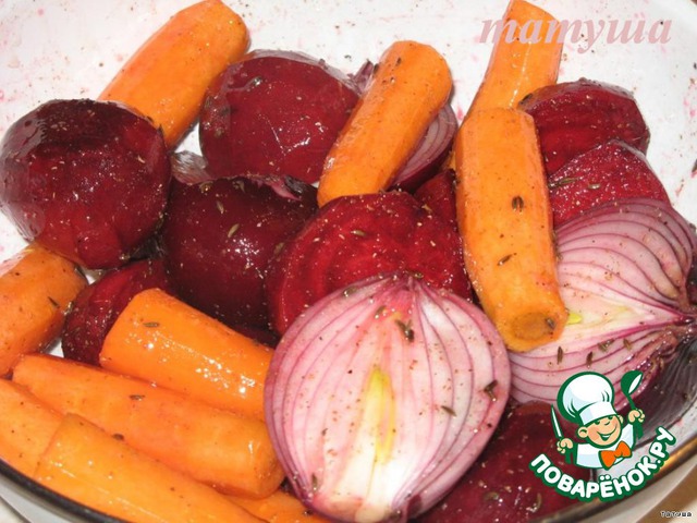 Хорошо перемешать заправку с овощами. В духовку на 30 мин при 200 градусах, затем перевернуть и еще 30 минут.