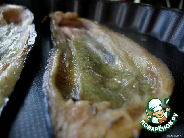 Баклажаны смыть, обжарить с каждой стороны по 5-7 минут. Мякоть выбрать и крупно порубить.