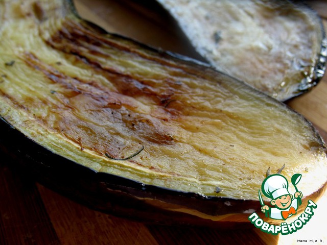 Баклажаны разрезать вдоль пополам, посыпать солью и оставить.
