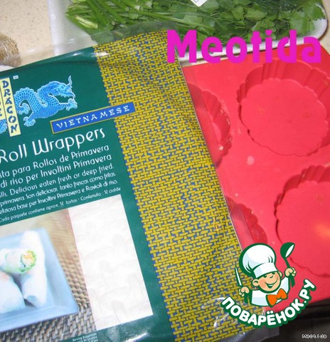 готовые корзиночки достаем из формы..посыпаем обжаренным кунжутом, еще раз надо побрызгать соевым соусом, украшаем свежей зеленью и...