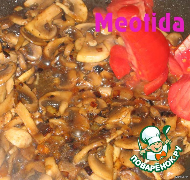 добавляем порезанные грибочки и помидорчик, тушим, периодически помешивая, приправив солью и перчиком