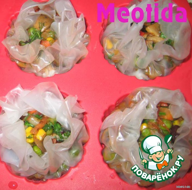 приподнимаем кончики рисовой бумаги вверх, их нужно немного слепить между собой, формируя корзиночки