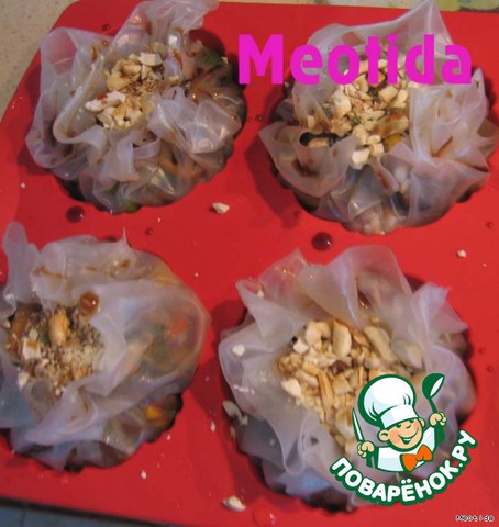 в центр корзиночек насыпаем немного измельченных орешков (кешью), затем нужно все слегка побрызгать соевым соусом, кунжутом и...