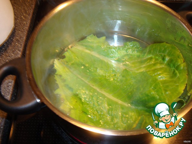 Отбираем большие листья салата. Промываем, кладем на 5 секунд в кастрюлю с кипящей водой и сразу же вытаскиваем.