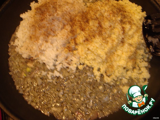 Отвариваем до полуготовности по отдельности рис и пшено. Мелко нарезанный лук обжариваем на оливковом масле. Добавляем крупы, сок лимона, соль, специи. Все хорошо перемешиваем и убираем с огня.