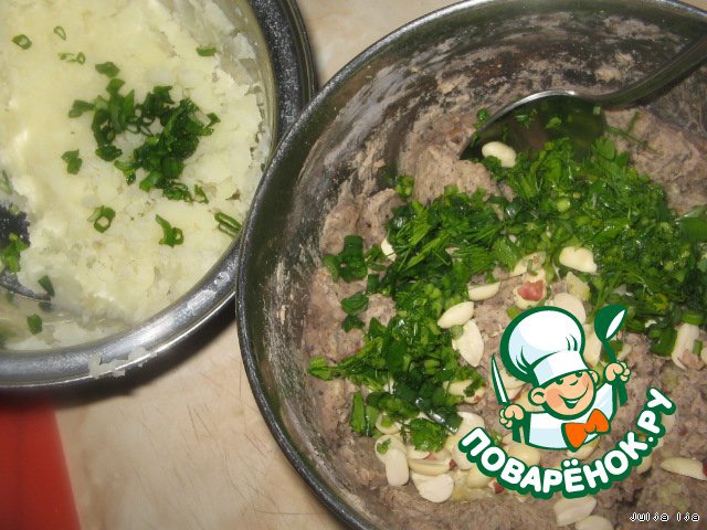 В фасоль добавить очищенный арахис, измельчённый чеснок, нарезанную зелень (петрушку и укроп). В картофель, добавить нарезанный зелёный лук. Также нарезанную зелень (петрушку, укроп и лук), добавить к тущёным овощам.