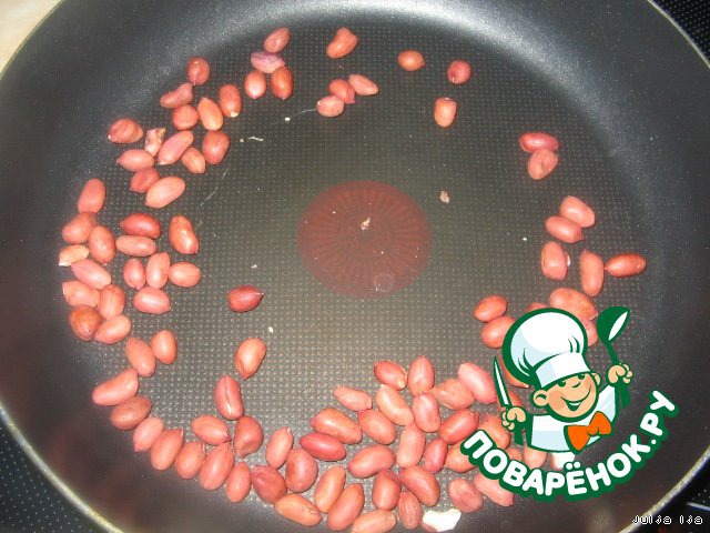 Арахис поджарить на сухой сковороде. Это в случае, если он сырой. Можно взять пакетик готового арахиса.