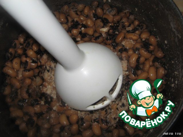 С фасоли слить почти всю жидкость (на время, в какую-нибудь ёмкость). Пюрировать блендером. Если покажется очень сухо, добавить немного жидкости.