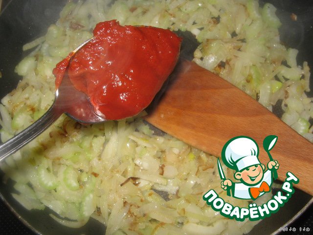 Томатную пасту и немного воды. Посолить и поперчить по вкусу.