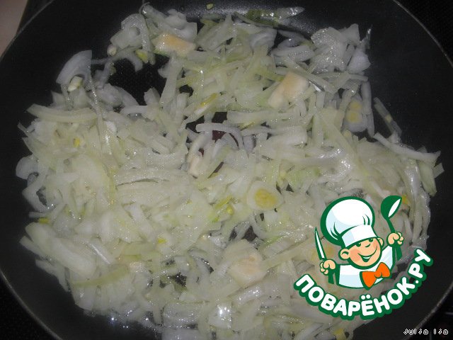 Лук, нарезать соломкой. Обжарить на растительном масле.