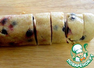 По истечении времени нарезать колбаску на кусочки толщиной 1,5 см.