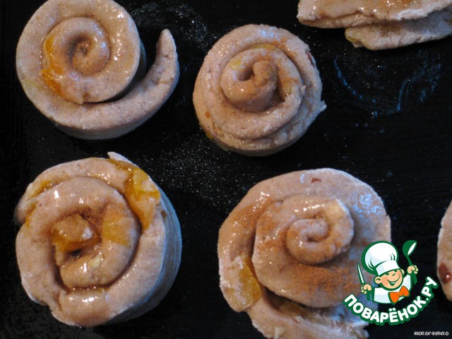 Раскатываем их скалкой, смазываем каждую полоску сиропом и посыпаем сахаром и корицей, закручиваем в «улитку».