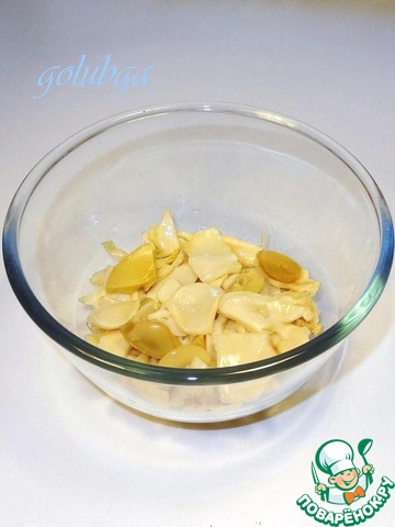 Отваренные грибы нарезать тонкими пластинами