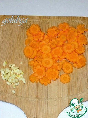 Морковь нарезать кружочками. Зубчики чеснока порубить.