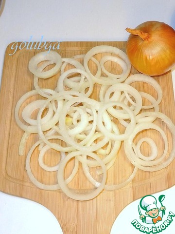 Лук нарезать толстыми кольцами и обжарить на растительном масле.
